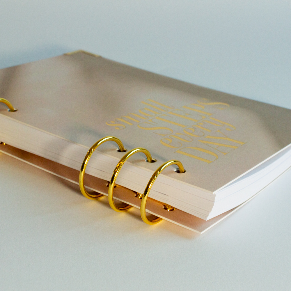 Für 2025 haben wir eine wunderschöne goldene 6-Ring-Mechanik gewählt. Hiermit hast du einen kostbaren und einzigartigen Begleiter, dessen Bindung vom Buchbinder in Deutschland liebevoll gefertigt wird. Die edle Folienprägung auf dem Cover wird direkt in Karlsruhe aufgebracht und macht den Taschenplaner zu einem exklusiven Hingucker. Doch nicht nur von außen ist der Planer ein echter Eyecatcher. Damit ist der Planer eine echte Hommage an den Start von nuts & golden.